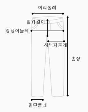 | 인치(inch) | 허리둘레 | 엉덩이둘레 | 허벅지둘레 | 밑단둘레 | 밑위길이 | 총기장 |