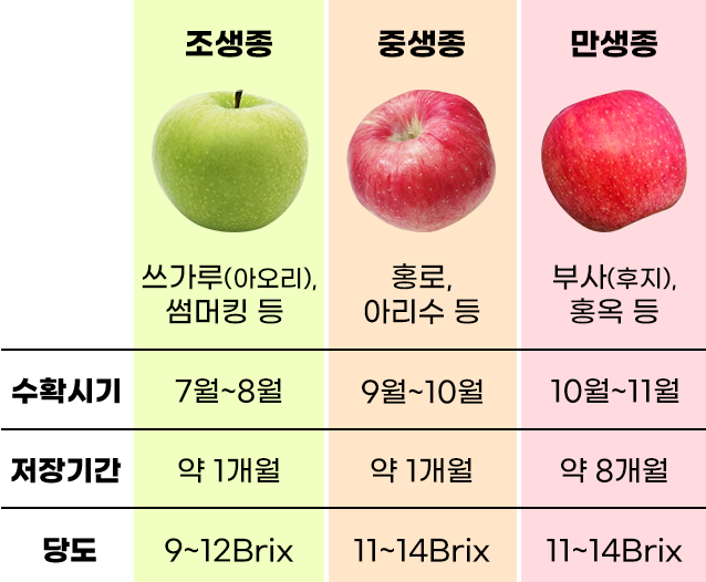 사과는 크게 조기, 중기, 후기 품종으로 나눌 수 있습니다.