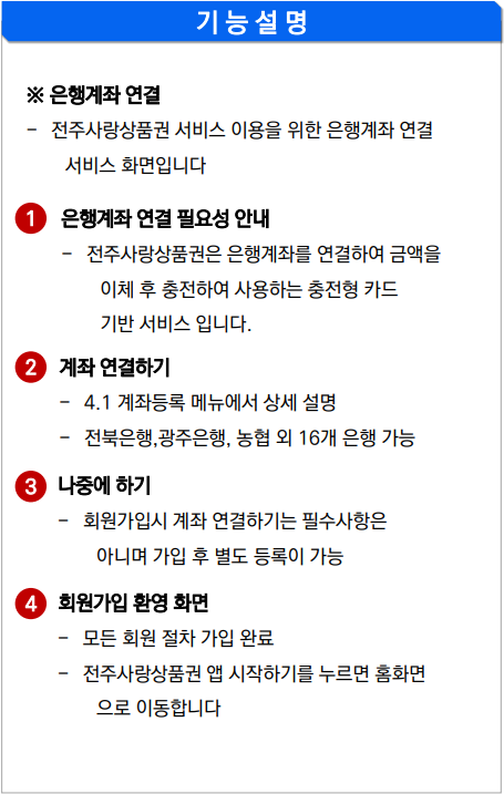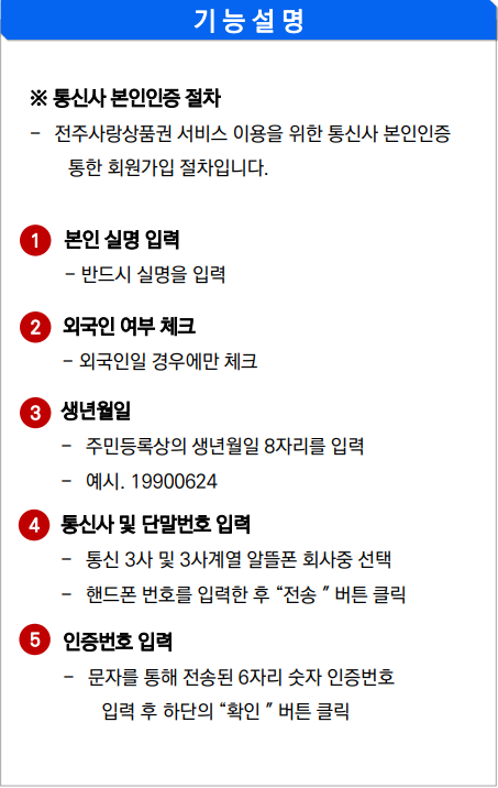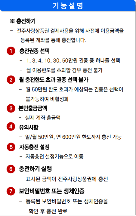 | 구매 방법 | 전북은행 영업점 방문 후 신청,(온라인신청) 전주사랑상품권 앱 설치 후 신청(카드 수령까지 2~3일 소요) |
